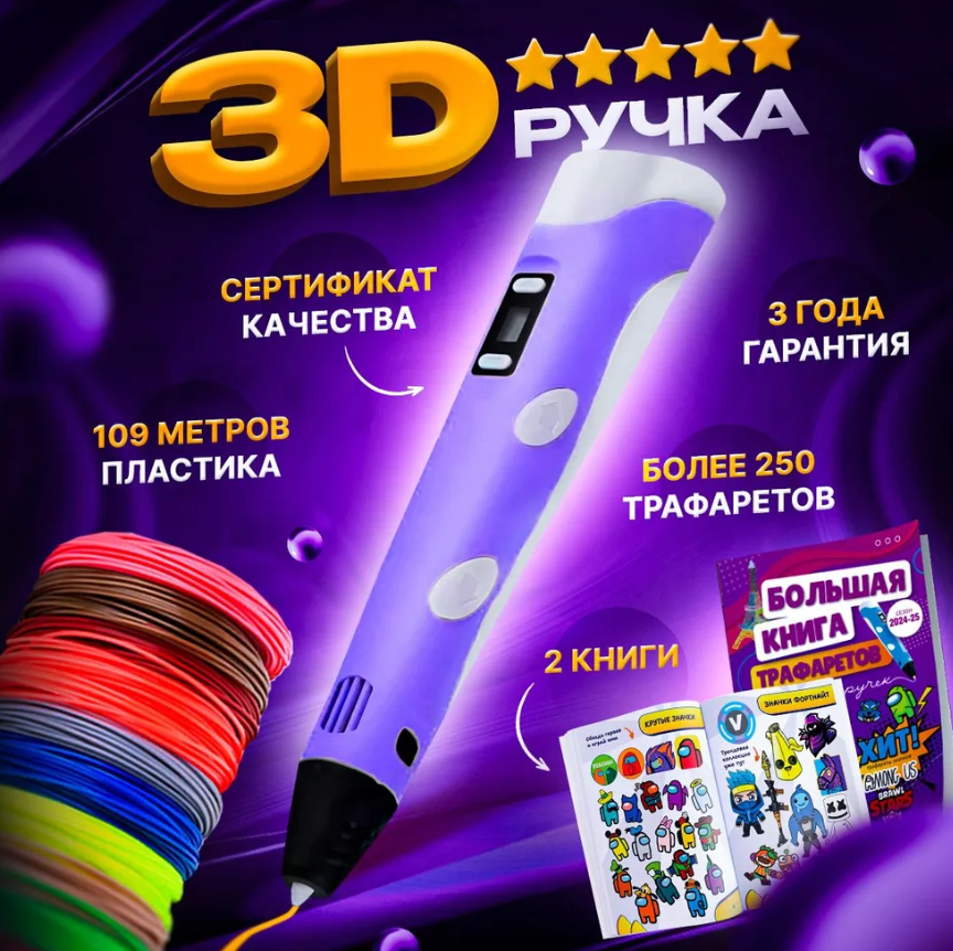 3D ручка с набором пластика и трафаретами, 3д ручка набор для творчества