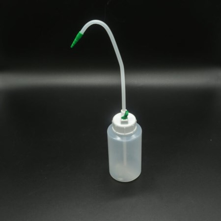 Пластиковые промывалки представляют собой сосуд из достаточно мягкого пластика, чаще всего полиэтилена, и крышки со встроенной трубкой с узким кончиком. Раствор подается за счет сжатия сосуда. Регулирую силу сжатия легко получить струю нужной силы.