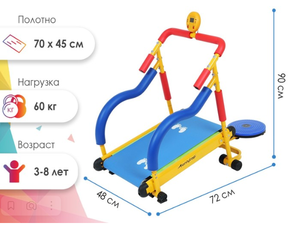 Беговая дорожка предназначена для детей от 3 до 8 лет. Максимальный вес пользователя – 60 кг. Электронный монитор показывает время занятия, скорость, пройденную дистанцию и количество израсходованных калорий. Монитор включается и выключается автоматически.