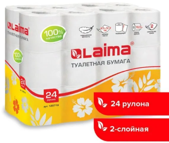 Бумага туалетная бытовая, спайка 24 шт., 2-х слойная, (2418,5 м), LAIMA, белая