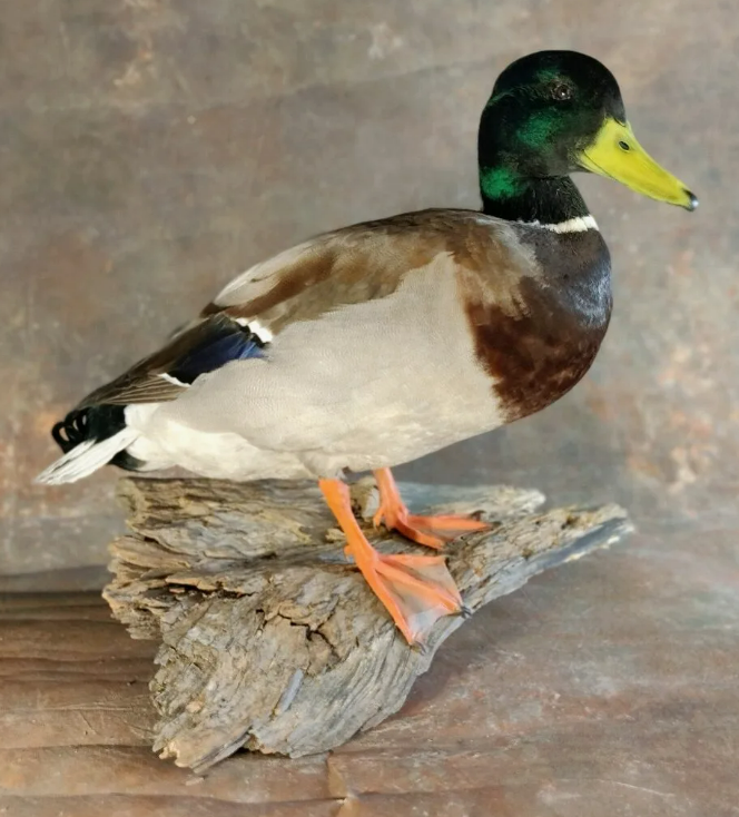 Селезень кряквы имеет красивый окрас, особенно яркий в весенний период. При правильной обработке чучело такой утки практически не отличимо от живой птицы.