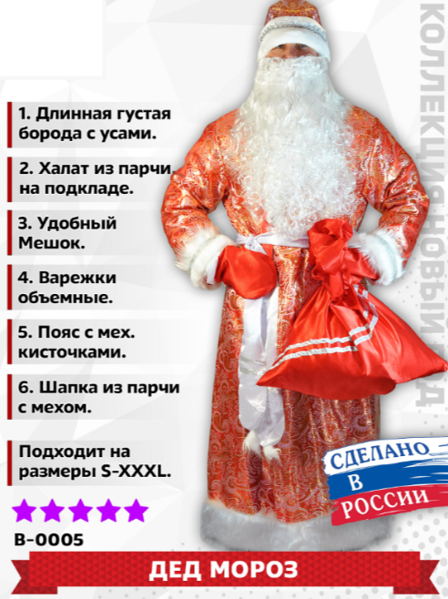 Халат на подкладе (парча), украшенный мехом, шапка (парча), борода, мешок, пояс, рукавицы.