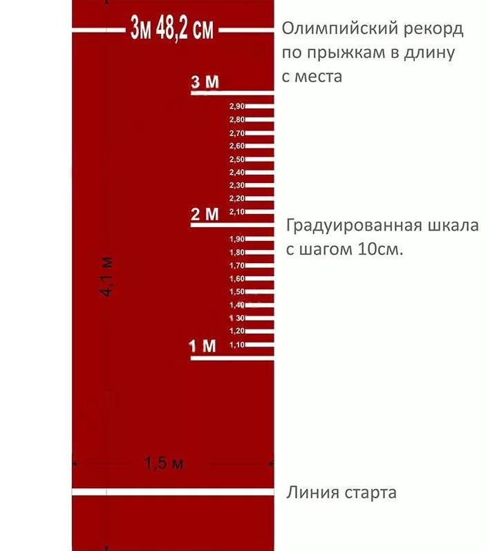 Представляет собой коврик из плотной монолитной резины размером 4 м 10 см в длину и 1 м 50 см в ширину. Цвет покрытия – красный/терракотовый. На дорожку нанесена разметка от 1 до 3 метров с шагом 10 см, а также дополнительно отмечен мировой рекорд по прыжкам в длину.