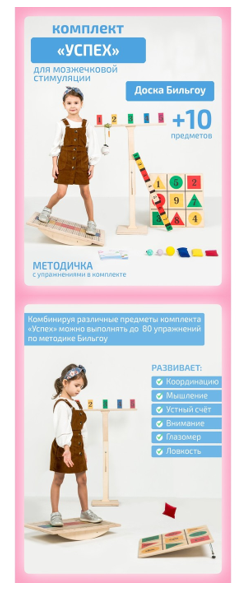 С комплектом «Успех» вы сможете выполнять до 80 различных упражнений по методике Бильгоу. Набор максимально эффективен для развития пространственной координации, многокомпонентной мозжечковой стимуляции. Подходит для тех, кто планирует регулярные занятия по методике Бильгоу. Можно применять в детских центрах, на занятиях у логопедов, дефектологов, нейропсихологов.