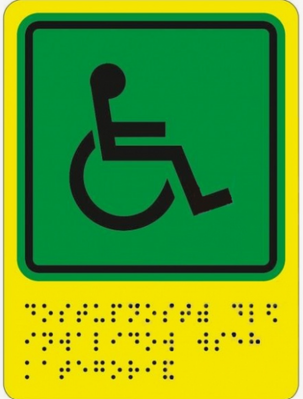 Указатель, обозначающий доступность для инвалидов всех категорий. Обладает тактильным эффектом. Воспринимается незрячими и слабовидящими людьми, так как продублирован информацией по системе Брайля. Рекомендован к применению ВОС, гос. программой "Доступная среда".