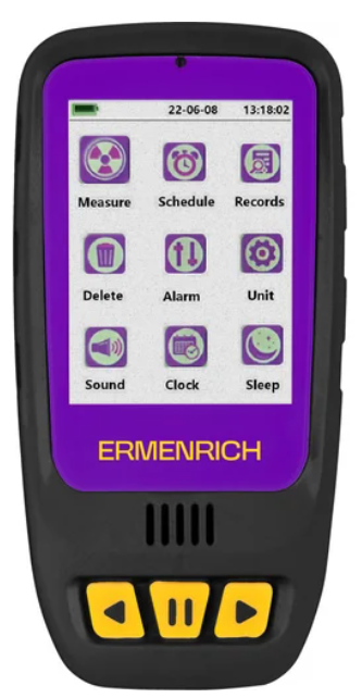 Дозиметр Ermenrich Ping RD40 измеряет гамма-, бета- и рентгеновское излучение в окружающей среде – воздухе, воде, продуктах питания, предметах обихода. Счетчик Гейгера-Мюллера считывает уровень излучения в диапазоне от 0,08 мкЗв до 50 мЗв меньше, чем за 10 секунд, а в случае опасно повышенной дозы – подает звуковой или световой сигнал.