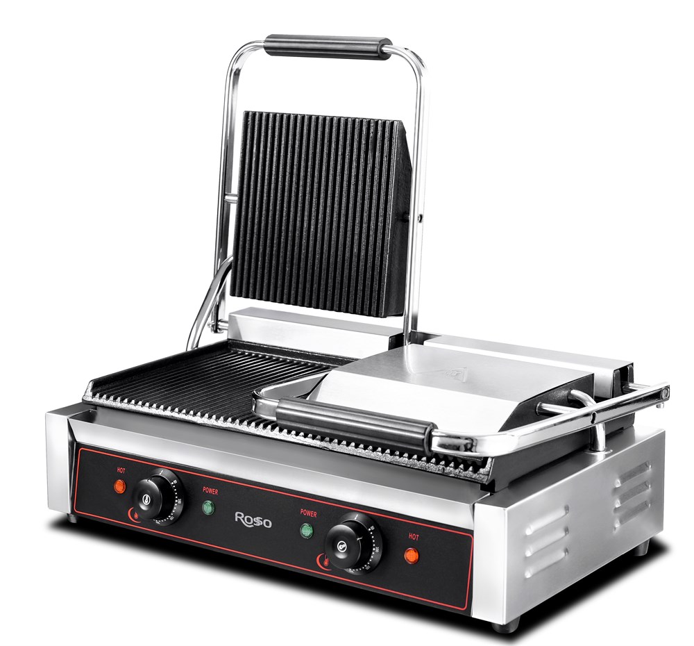 Корпус из нержавеющей стали. Поверхность нагрева — рифлёная, две верхних и две нижних. Температурный режим 0…300°С. Верхняя зона нагрева 345х237 мм.
