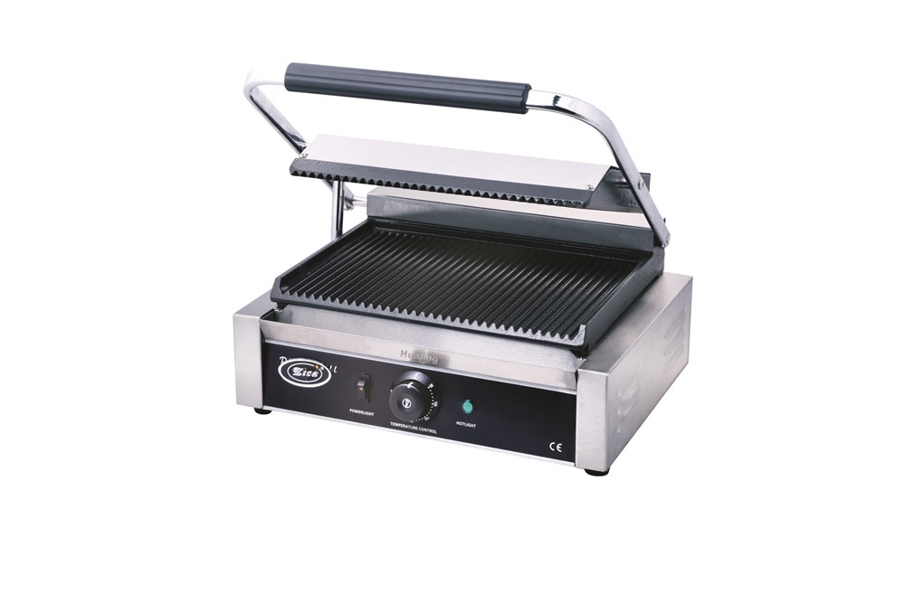Одна секция, поверхность — рифленая, температура нагрева 50-300С., размер рабочей поверхности: нижняя 345х237 мм, верхняя 345х237 мм, чугунные рабочие пластины, поддон для жира, индикатор работы и нагрева