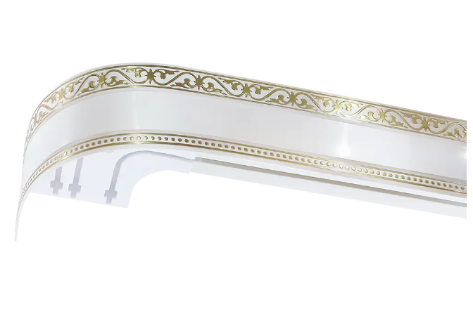 Карниз трехрядный Монарх предназначен для крепления к потолку. Плавные закругления на концах позволяют красиво оформить оконную зону. Планка карниза оформлена оригинальным орнаментом.
