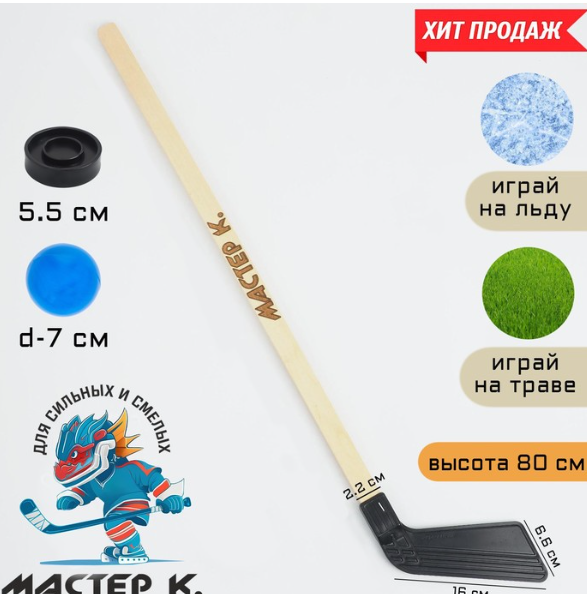 Клюшка для игры в хоккей "Мастер К", набор: клюшка 80 см, шайба 5.5 х 1.5 см, мяч d-7 см