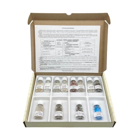 В коллекции представлены 12 видов наиболее часто применяемых в сельском хозяйстве минеральных удобрений, относящихся к следующим группам: