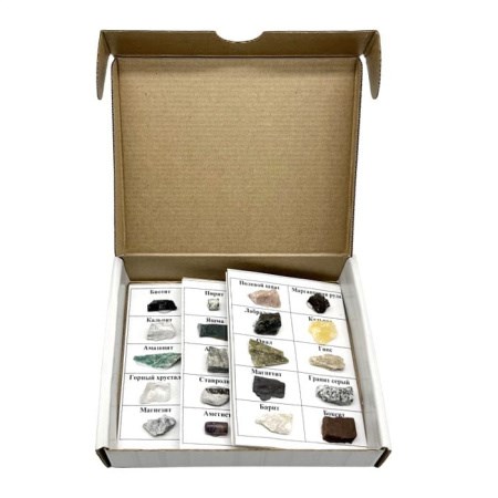 На каждой планшетке, форматом 120х90 мм, наклеены образцы различных минералов по 10 шт., представляющих собой горные породы, рудные минералы, поделочные камни. Под каждым образцом имеется его название. На оборотной стороне планшетки обозначены места добычи каждого минерала. Каждая планшетка уложена в полиэтиленовый пакет с замком. Планшетки уложены в упаковочную коробку. Образцы уложены в ложементы упаковочной картонной коробки.