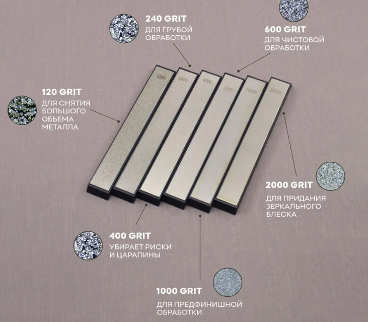 400 грит: Используется для удаления рисок и царапин, оставленных брусками с более крупной зернистостью. Подготавливает лезвие к более тонкой обработке.