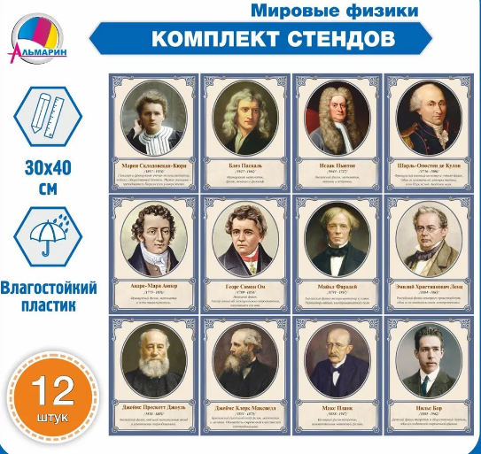 Комплект стендов для кабинета физики "Мировые физики" включает 12 информационных стендов размером 40×30 см. Купить комплект стендов для кабинета физики "Мировые физики" — значит обеспечить учебное пространство наглядными и информативными материалами, которые помогут учащимся лучше познакомиться с основными представителями мировой физики.