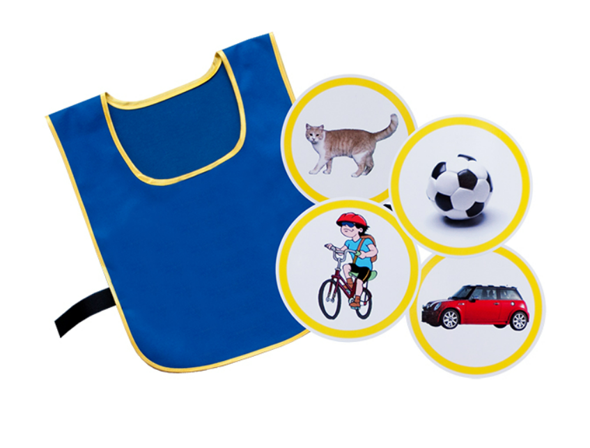 Игровой набор представляет собой комплект из ярких сине-желтых жилетов, надевающихся через голову, и круглых цветных тематических картинок.