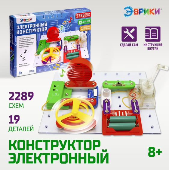 Конструктор электронный «Эврики», 2289 схем, 19 элементов, работает от батареек