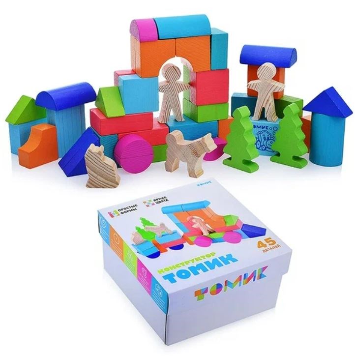 • Комплектация: 45 деталей разной формы, цвета и размера, памятка по использованию деревянных игрушек.