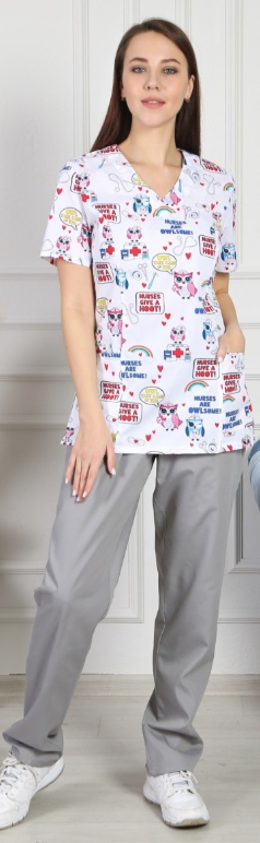 Костюм медицинский серые брюки, рубашка с рисунком