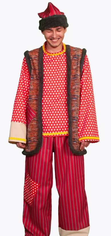 Карнавальный набор "Емеля-2" мужской на размер 48-52/176-182см;состоит из рубашки, брюк, жилета, шапки. Брюки на резинке в поясе, шапка без подкладки.