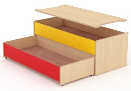 ЛДСП 16 мм, на спинках противоударный врезной кант 2 мм, на остальных деталях кромка 0,4 мм. Задние бортики кроватей выступают, что при выдвижении позволяет кроватям цепляться друг за друга. Нижние части опор(боковин) кроватей оборудованы колесными опора