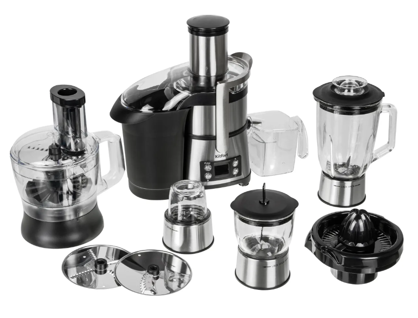 В комплекте: измельчитель, блендер, соковыжималка, тёрка, шинковка,