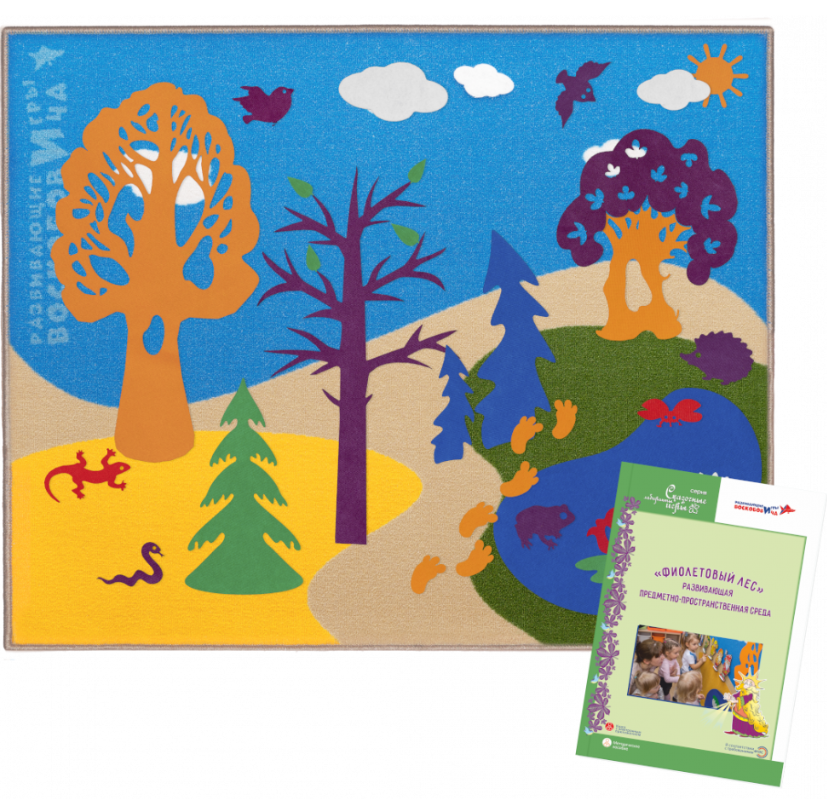 2. Переносные модульные элементы из ковролина для крепления к основе: дерево (4 шт.), ёлка (3 шт.), озеро (1 шт.), солнышко (1 шт.), цветок, кувшинка (2 шт.), цветок (1 шт.), золотой плод (5 шт.), лист фигурный (10 шт.), лист ажурный (10 шт.), лист 3-х размеров, 4-х цветов (72 шт.), лист кувшинки (2 шт.), бабочка (2 шт.), божья коровка (1 шт.), стрекоза (1 шт.), птица (3 шт.), ласточка (1 шт.), ёжик (2 шт.), мышка (2 шт.), лягушка (1 шт.), змейка (1 шт.), ящерица (1 шт.), улитка (1 шт.), следы (5 пар).