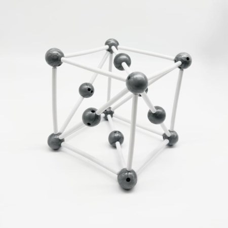Модель «Кристаллическая решетка меди» (далее - модель) предназначена для демонстрации атомной структуры кристаллической решетки меди в рамках изучения курса химии в общеобразовательных учреждениях. Модель позволяет демонстрировать кубическую гранецентрированную кристаллическую решетку меди. Модели атомов серого цвета в узлах решетки обозначают атомы меди.