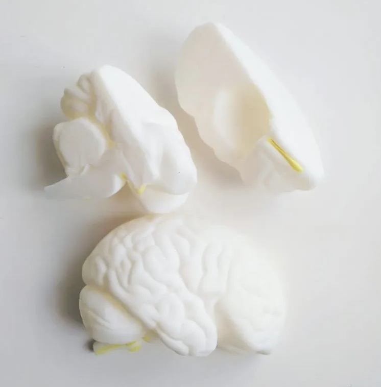 Модель высотой около 10 см, изготовлена из пластмассы и снабжена пластмассовой подставкой. Модель является разборной. Она отображает внешнее строение мозга человека и его сагиттальный разрез, что позволяет рассмотреть следующие отделы: 1. Продолговатый мозг 5. Промежуточный мозг 2. Мост 6. Большие полушария мозга 3. Мозжечок 7. Кора больших полушарий 4. Средний мозг