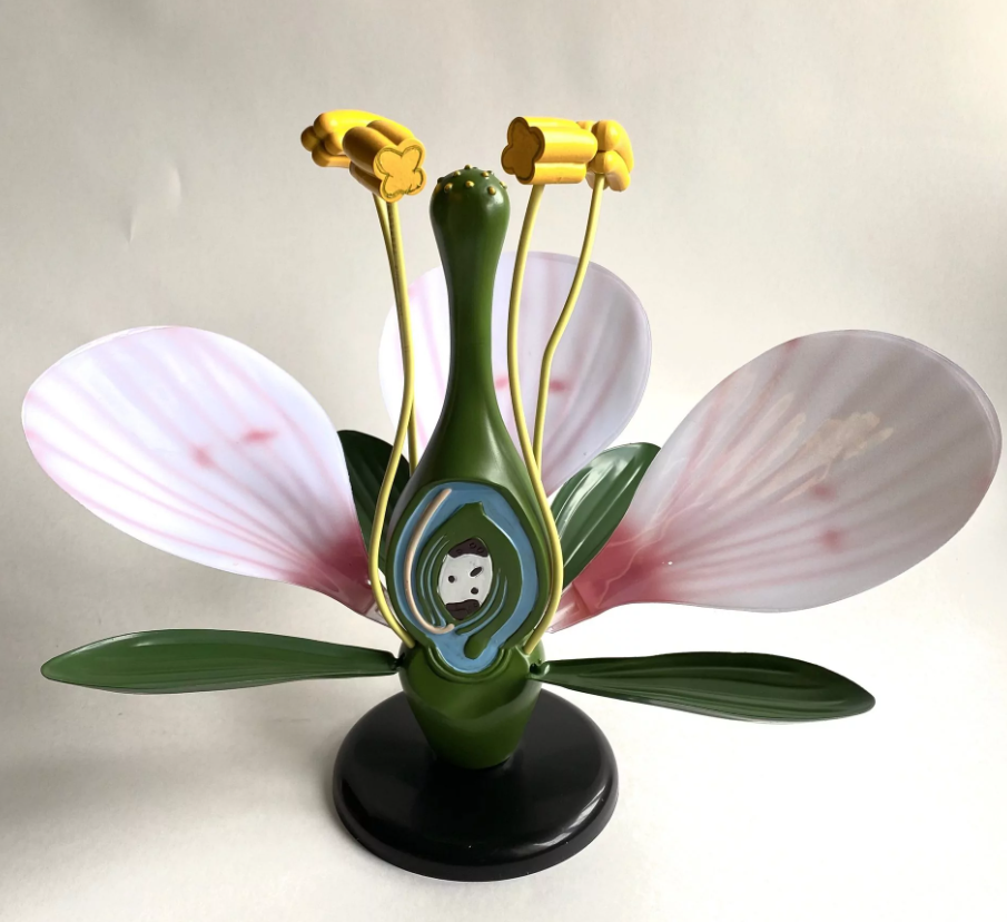 Модель представляет собой увеличенный цветок яблони в разрезе и позволяет рассмотреть особенности внешнего и внутреннего строения цветка яблони, а также внутреннее строение завязи пестика. На модели представлены следующие детали строения: цветоножка, цветоложе, чашелистики, лепестки венчика, тычинки (тычиночные нити и пыльники), пестик (рыльце, столбик, завязь), пыльцевая трубка, семяпочка, семязачаток, яйцеклетка, центральная клетка.