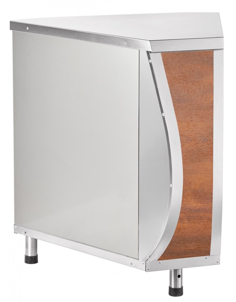 Модули поворотные МП-45Т-01 кашир. предназначены для установки линии прилавков самообслуживания с поворотом на 45° или 90° (наружным поворотом или внутренним поворотом — Конструкция выполнена из металла, кашированного под дерево.варианты -01).