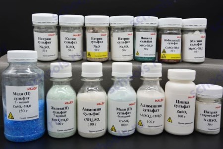 Учебный и лабораторный набор химических соединений для изучения и проведения опытов с сульфатами, сульфитами и сульфидами. Подходит для образовательных учреждений, лабораторий и практических занятий.