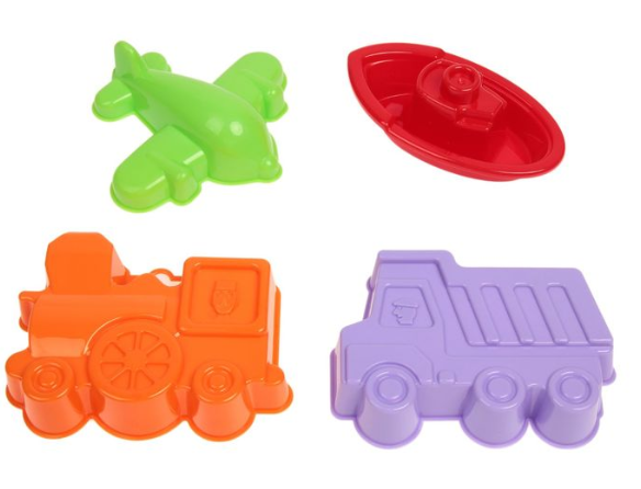 Набор №258, 4 формочки: самосвал, паровоз, самолёт, кораблик "Юнга", цвета МИКС