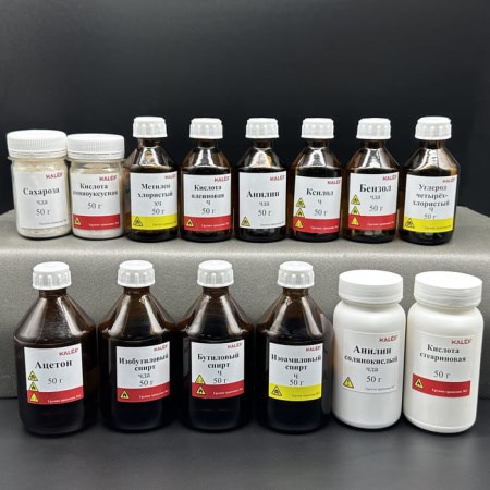 В набор включены различные органические соединения: аминокислоты, спирты, кислоты, кетоны и ароматические углеводороды, что позволяет проводить разнообразные лабораторные работы.