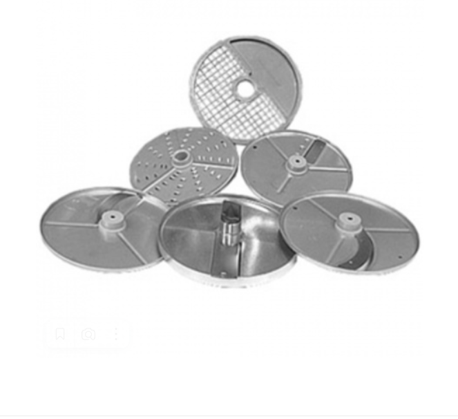 нарезка 2 и 4 мм, терка 2 мм, соломка 4х4мм, кубики 10х10мм.