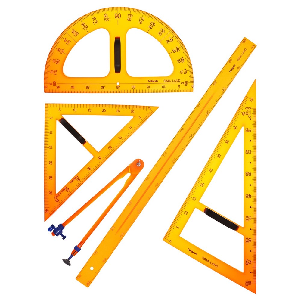 2 треугольника, 1 транспортир, 1 циркуль, 1 линейка.