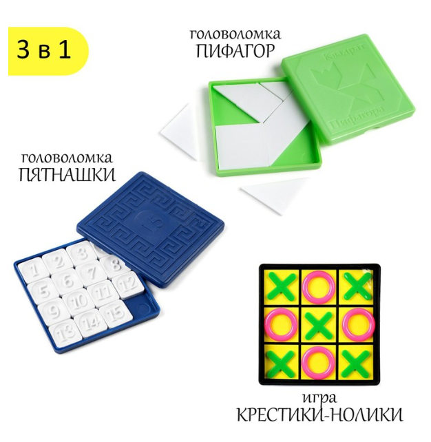 Набор головоломок 3 в 1: пятнашки классические, пятнашки Пифагор, крестики-нолики