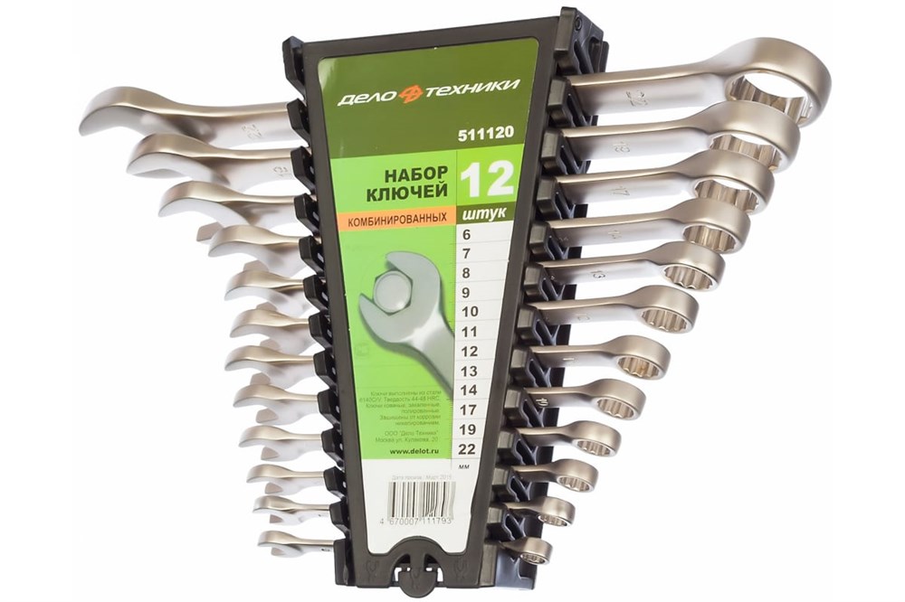 Набор комбинированных ключей 12 шт ДТ/10 Дело Техники 511120 – это многофункциональный комплект, который станет незаменимым инструментом в автомастерской, гараже, на строительной площадке и в школьных кабинетах технологии. Благодаря сочетанию рожковых и накидных головок каждый ключ из набора обеспечивает максимальную эффективность при работе с крепежами разного типа.