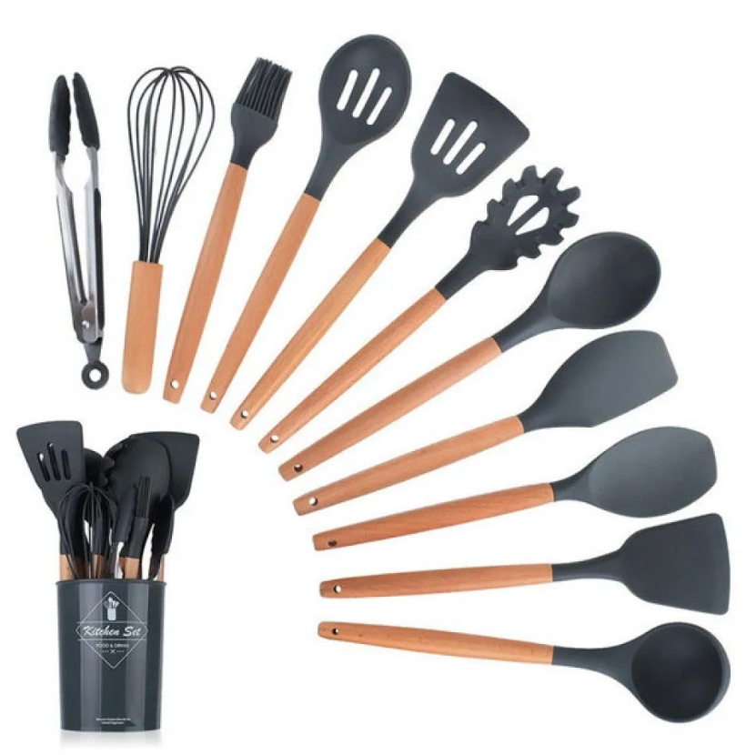 Включает лопатки, щипцы, кисточку и другие аксессуары, необходимые для готовки и выпечки.