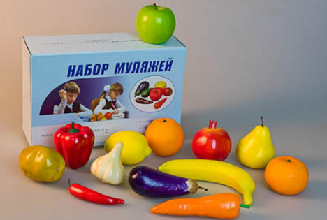 Комплектность: муляжи апельсина – 1 шт., перца чили – 1 шт., перца болгарского – 1 шт., картофеля – 1 шт., баклажана – 1 шт., яблока зеленого – 1 шт., мандарина – 1 шт., лимона – 1 шт., банана – 1 шт., груши – 1 шт., моркови – 1 шт., чеснока – 1 шт., граната – 1 шт.