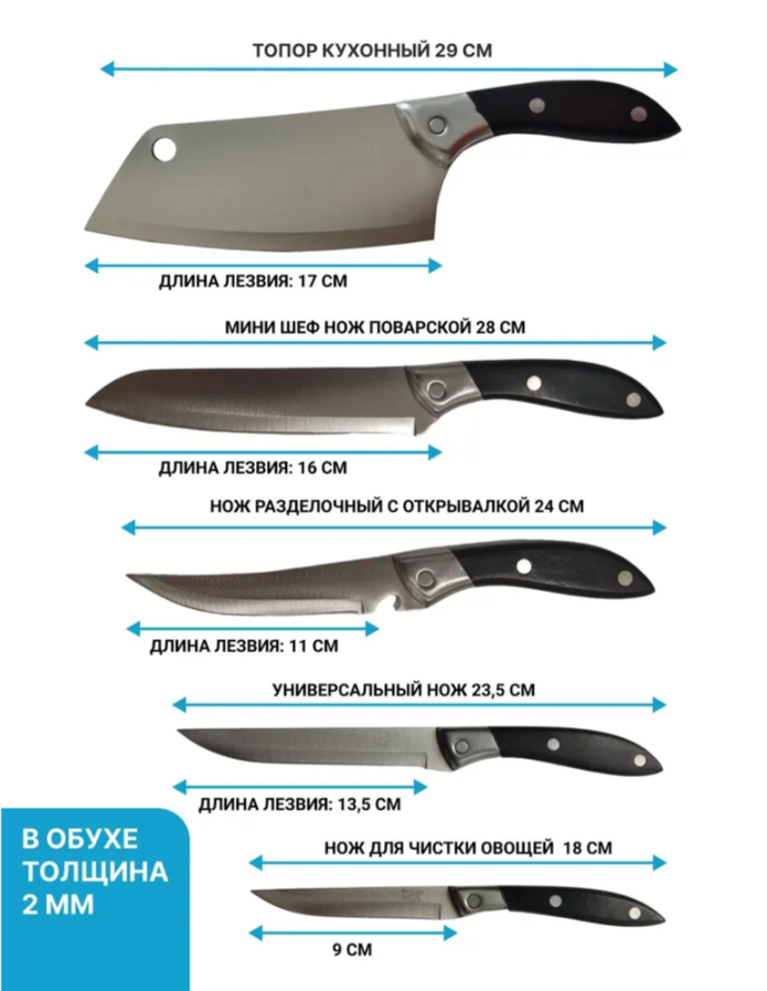 Аксессуары в наборе ножей: Кухонный топорик, Магнитный держатель, Подставка, Точилка для ножей
