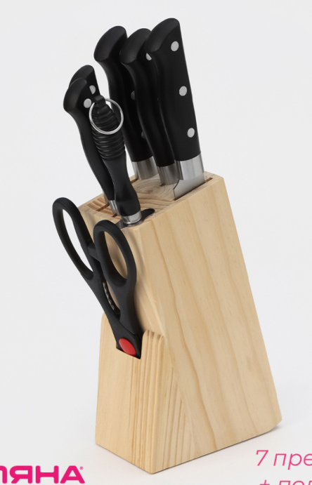 Набор ножей кухонных на подставке 7 предметов: 5 ножей, мусат и ножницы, чёрный