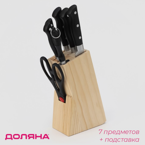 Набор ножей кухонных на подставке Доляна «Кронос», 7 предметов: 5 ножей, мусат и ножницы, цвет чёрный