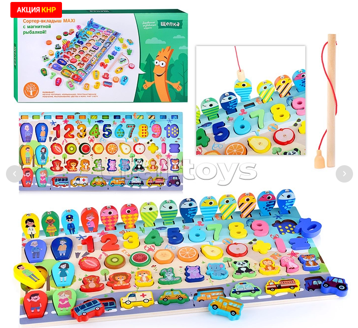 Большой многофункциональный набор для малышей с магнитной рыбалкой поможет малышу познакомиться с названиями профессий и животных, фруктов и видов транспорта, а также членов семьи, изучить цифры и цвета.