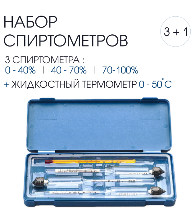 Набор спиртомеров, 3 шт.: 0-40%, 40-70%, 70-100%, + жидкостный термометр