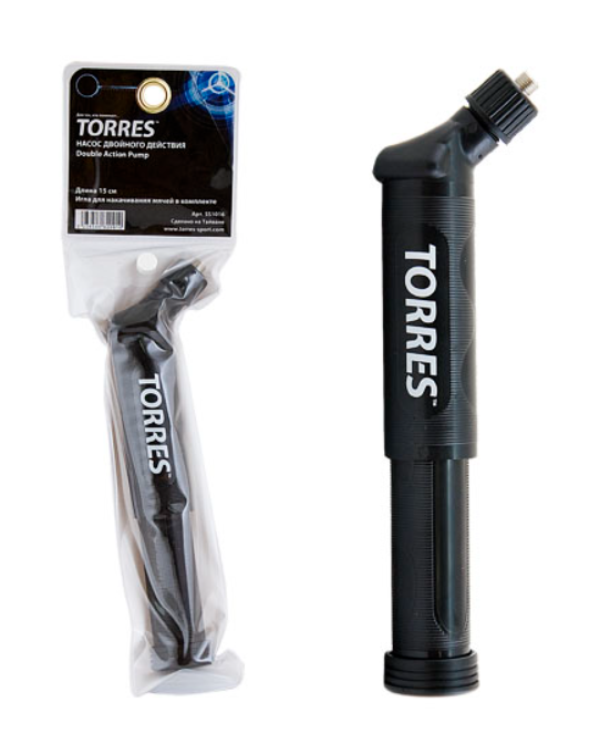 Насос двойного действия "TORRES", современная конструкция с боковой горловиной, длина 15 см, в комплекте игла с диаметром резьбы 7 мм для накачивания мячей, без гибкого шланга.