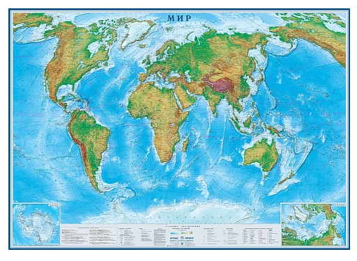 Настенная физико-политическая карта Мира р-р 2,02*1,43 м, матовая ламинация. Цветом показан рельеф суши и морского дна. Показаны границы всех стран Мира, подписаны названия их столиц. Для размещения карты на стену можно использовать двусторонний скотч.