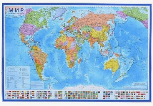 Настенная политическая карта Мира 1,43*1,02 м. Мелованная бумага с матовой ламинацией. Цветом показаны все страны Мира, подписаны названия столиц, изображены государственные флаги стран. Цветным фоном показан рельеф суши и морского дна.
