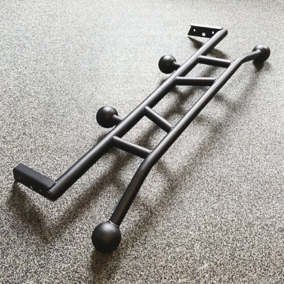 Изогнутая по краям труба перекладины сохраняет не только стандартные возможности турника (прямой, обратный, широкий хват), но и позволяет выполнять выходы силой, благодаря тому, что с внешней стороны на ней отсутствуют лишние элементы. В дополнение к этому, по краям располагаются шары диаметром 80 мм, которые усложняют широкий хват, делая его не каждому под силу