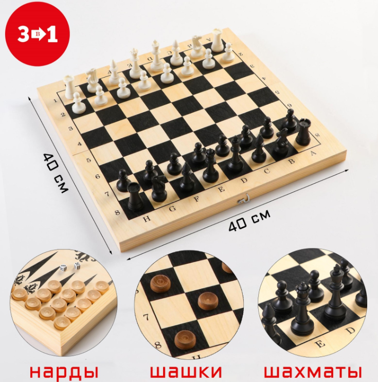 Настольные игры 3 в 1: шахматы, шашки, нарды, деревянные + пластик, большие, 40х40 см