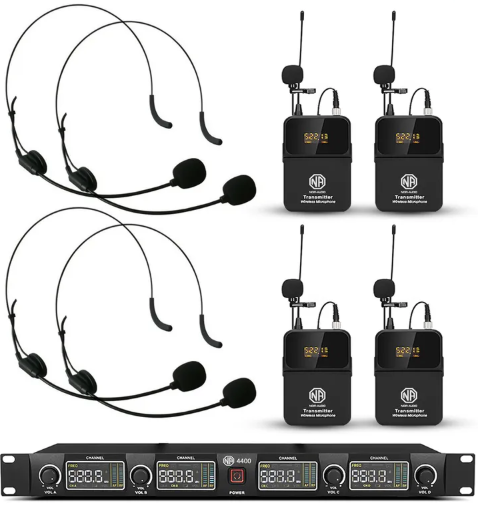 Приёмник - 1 шт., поясной передатчик - 4 шт., головной вокально-речевой микрофон черного цвета с ветрозащитой - 4 шт., петличный микрофон черного цвета с ветрозащитой - 4 шт., антенна для приёмника - 2 шт., адаптер питания для приёмника 12 Вольт 1 Ампер - 1 шт., кабель Jack 6,3 мм. моно - Jack 6,3 мм. моно 1 метр - 1 шт., картонная коробка - 1 шт.